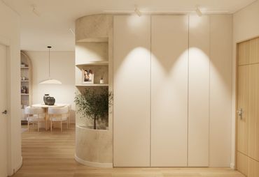 Destacamos las líneas curvas pare generar zonas de paso amplias y aprovechar la luz natural que llega desde el ventanal principal.