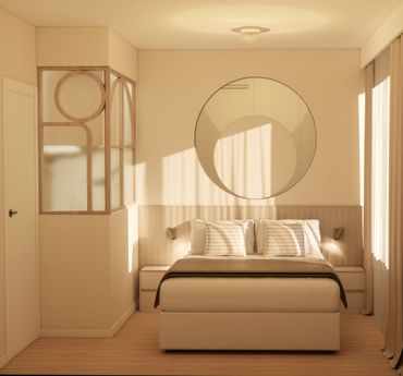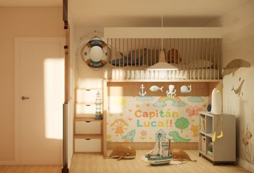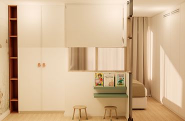 Zona de noche compuesta de 2 habitaciones divididas con un tabique a 90cm y sobre él una ventana muy especial a medida.